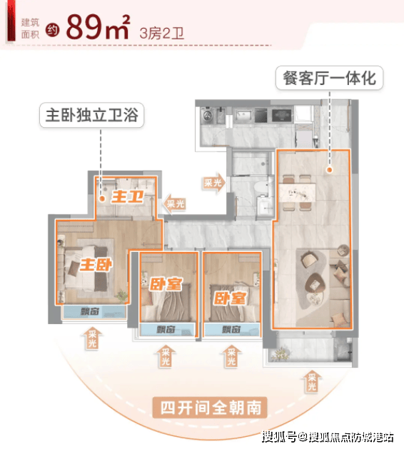 这款户型总价约347万元起,比76㎡户型多了一个卫生间,空间也更宽敞,适合三口之家或刚需改善人群。户型最大的亮点是三开间朝南,间间带飘窗,采光和通风效果拉满,每天都能享受充足的阳光,居住舒适度非常高。