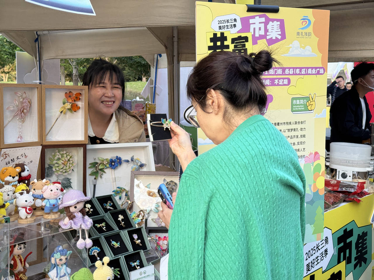 “这些都是由残疾人一针一线钩出来的。”展位负责人向记者介绍。这些展品来自衢州市“南孔残韵”共富市集——一个由衢州市残疾人联合会打造的特色残疾人手工文创产品公益品牌。