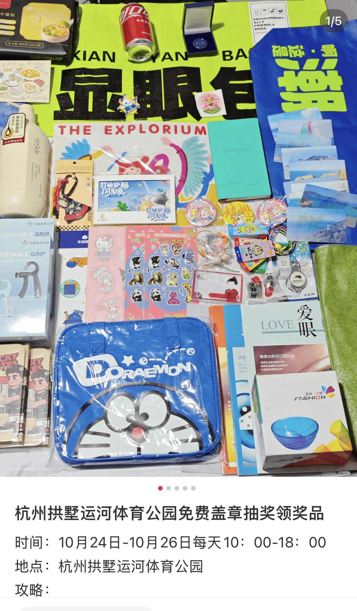黄先生发布在社交平台的攻略里,晒出了自己的战利品,包括洗发水、碗、便签本、各种徽章、各种贴纸。