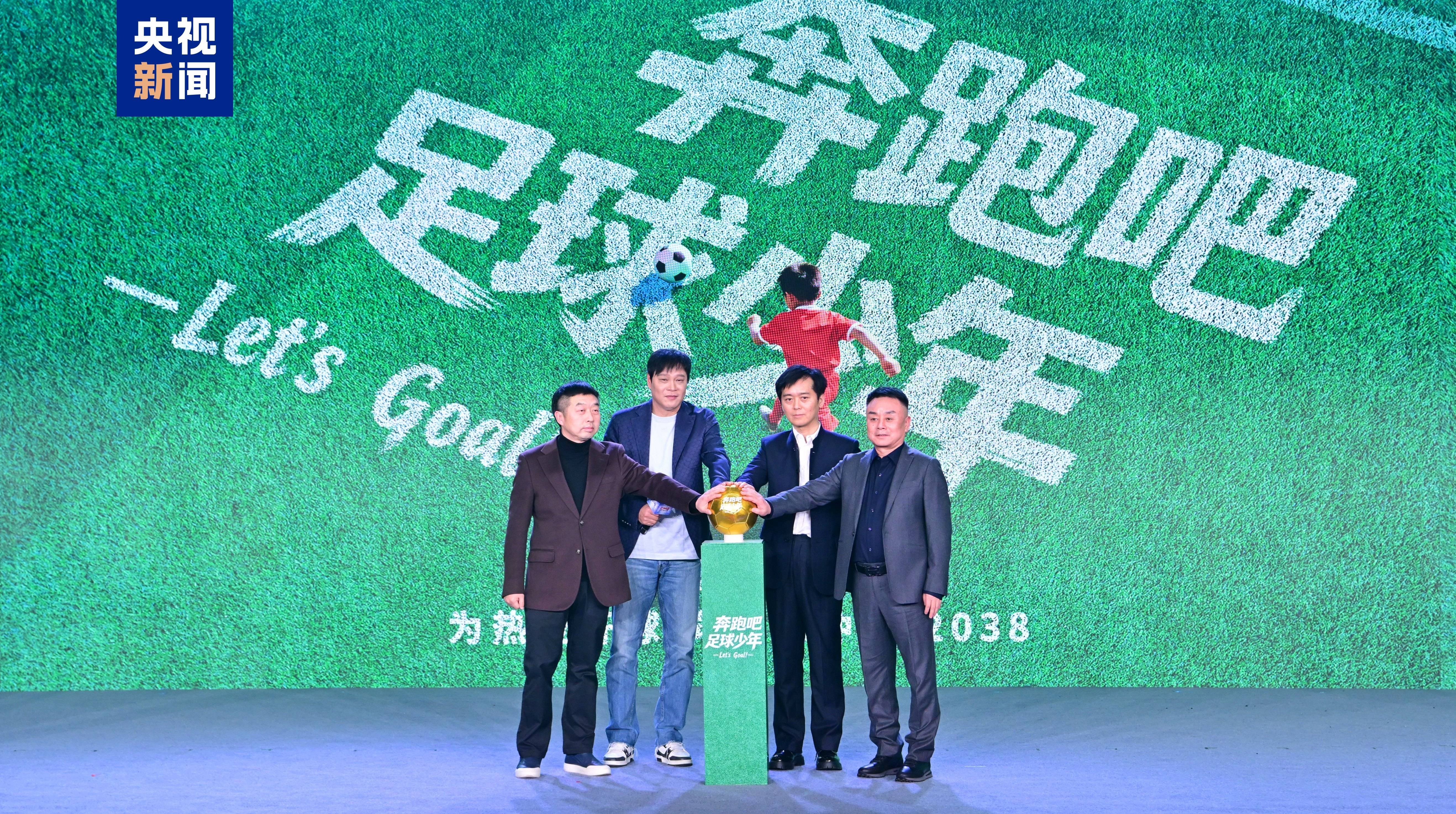 △中央广播电视总台视听新媒体中心副召集人许文广、中国首位亚洲足球先生范志毅、子良传媒(北京)有限公司董事长严文俊、北京天凡文化发展有限责任公司董事长邵琼启动《奔跑吧 足球少年》