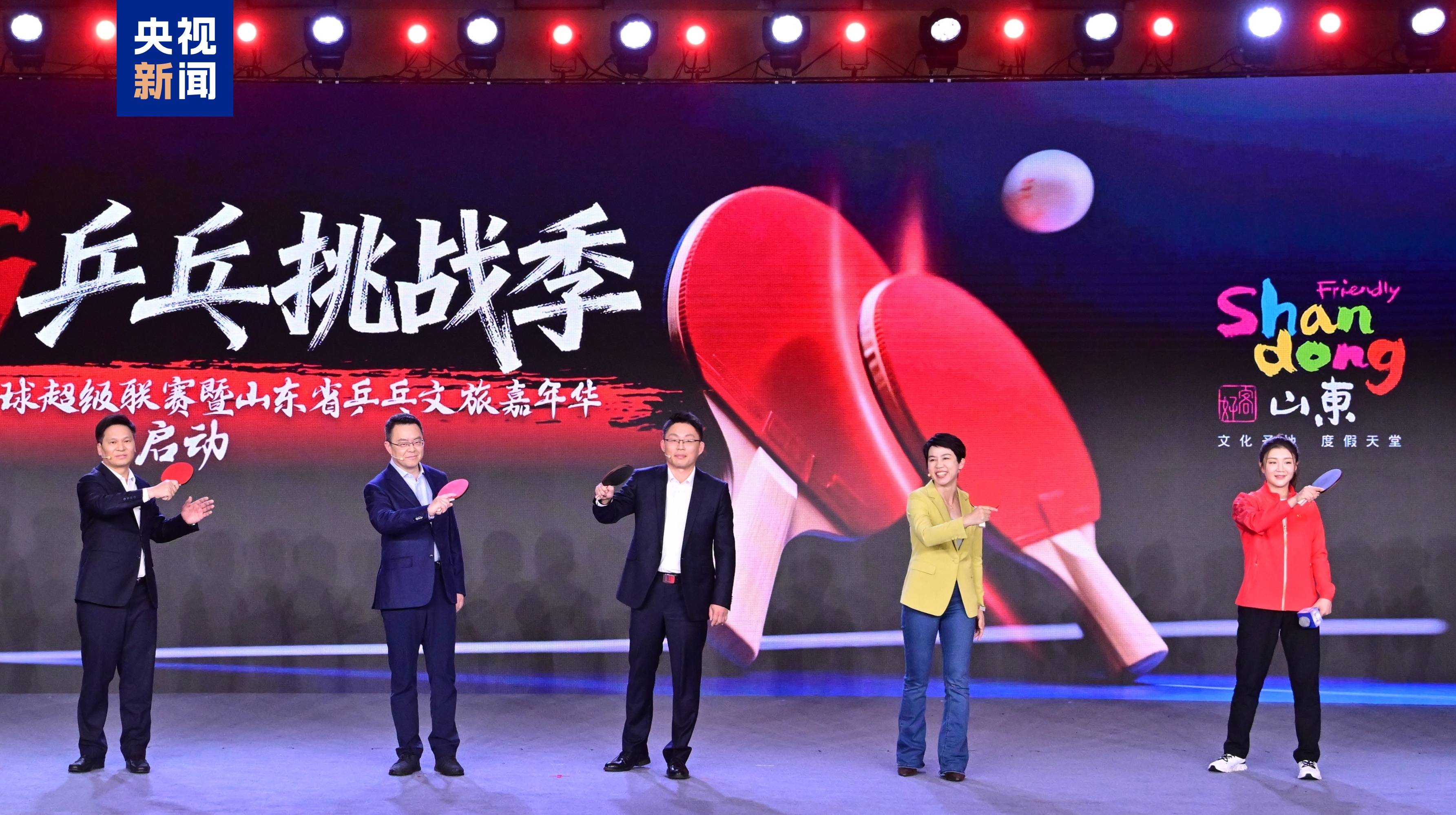 △山东省文化和旅游厅厅长喻剑南、山东省体育局副局长魏淑波、中国建设银行山东省分行行长文志军、中央广播电视总台山东总站副站长何盈、奥运冠军陈梦推介《CMG乒乓挑战季》